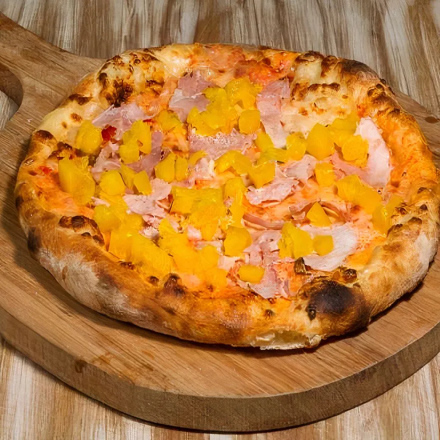 Pizza 6 porciones, 30 cm tomate en salsa, queso mozzarella jamón artesanal, piña.