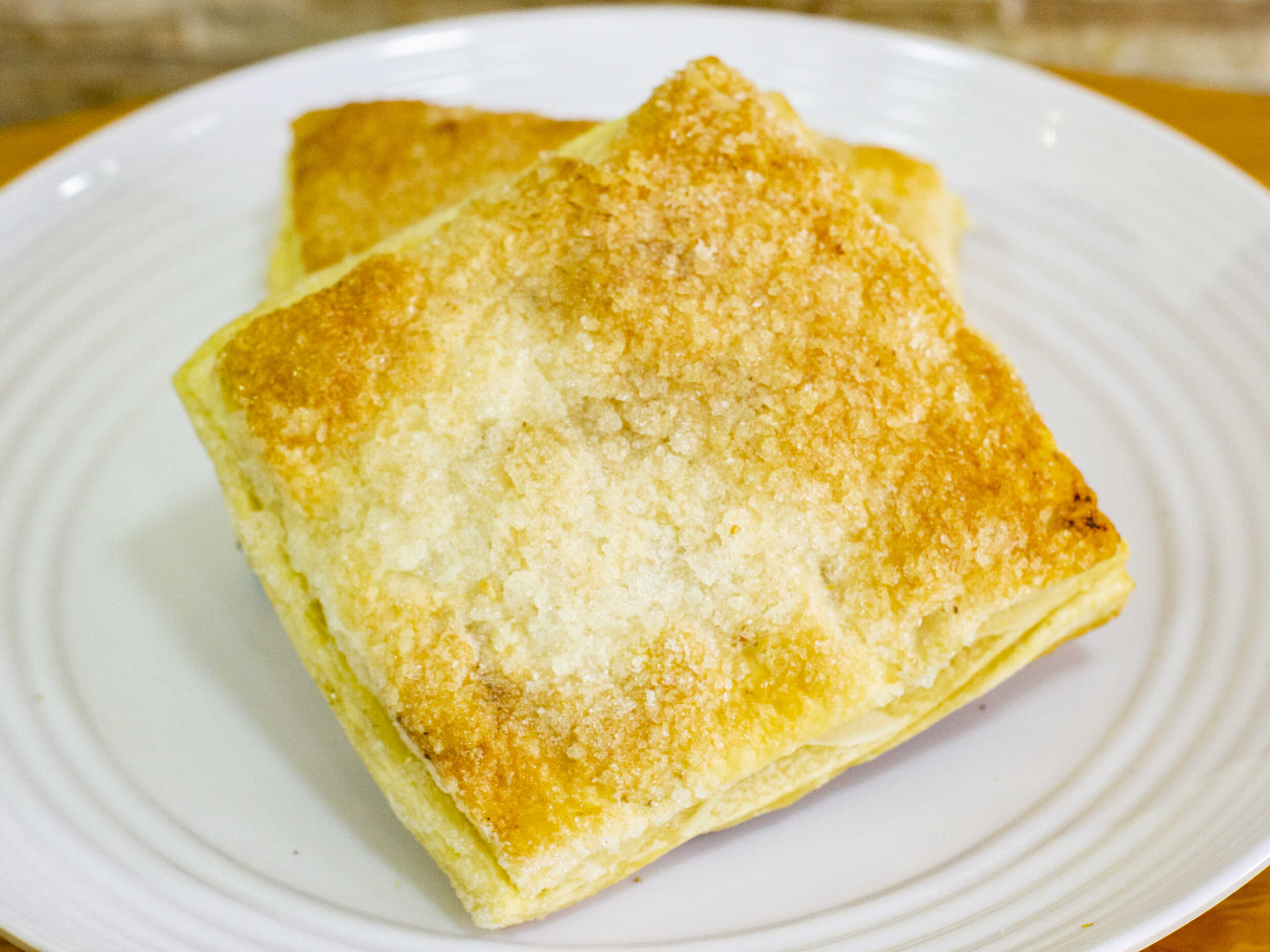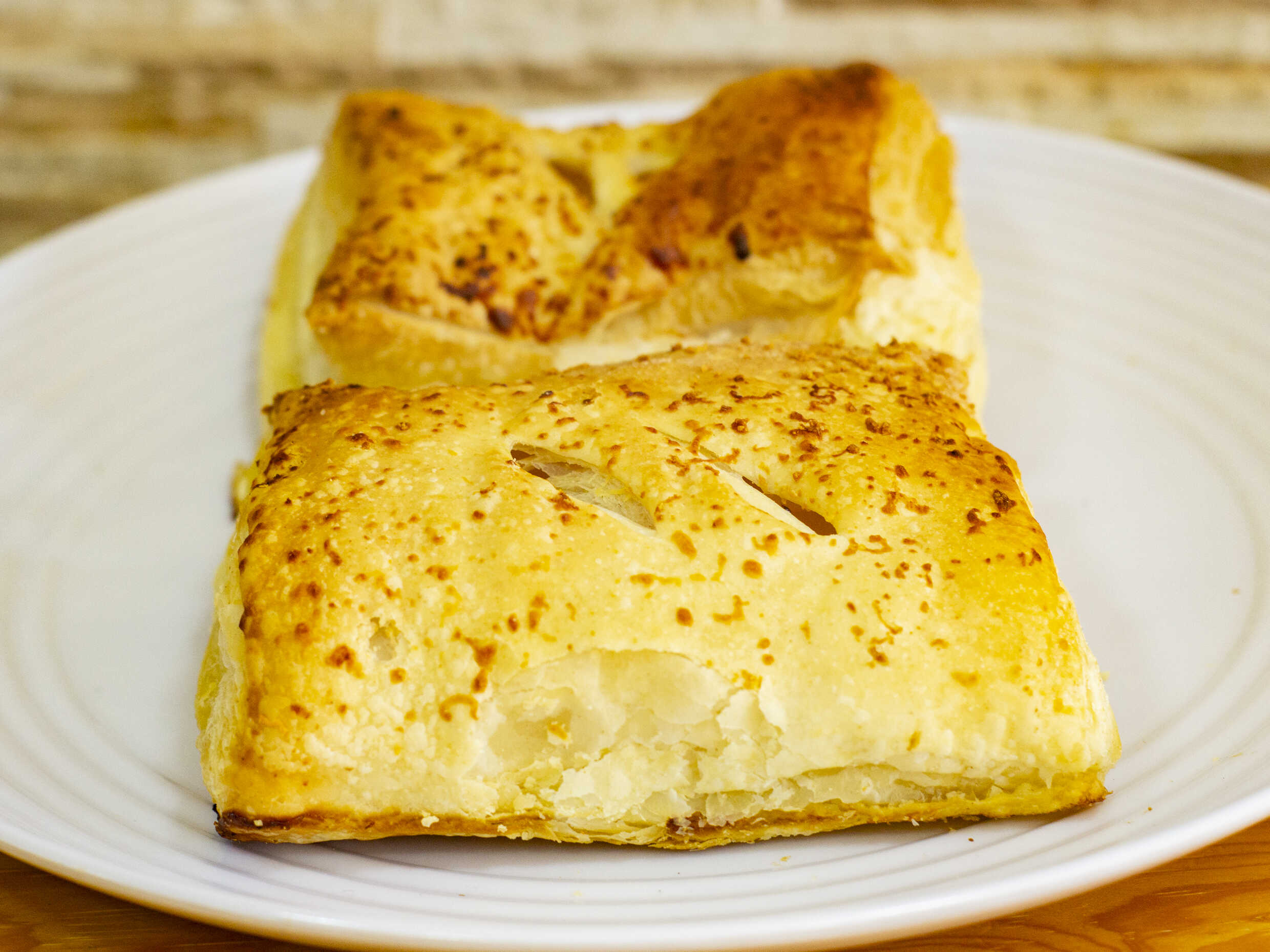 Pastel cuadrado hojaldrado relleno de cuajada.