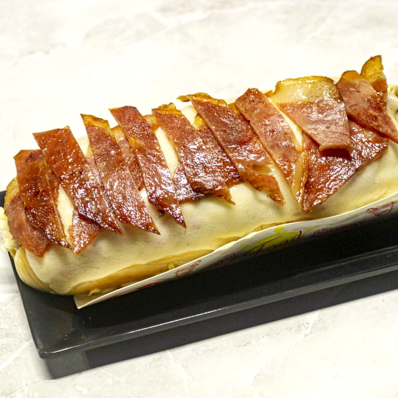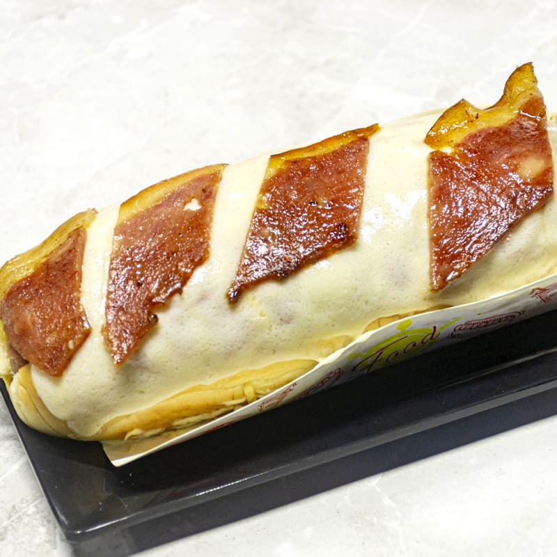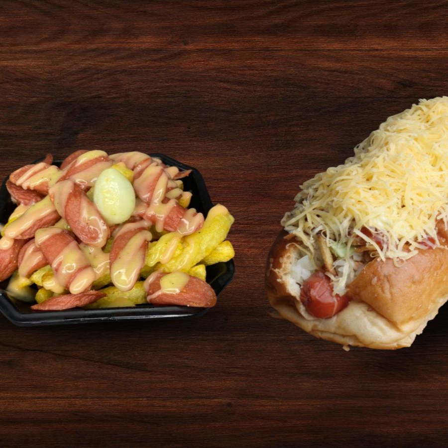 Pan con salchicha long, ensalada, cebolla caramelizada, salsas, ripio, queso mozzarella, maíz y tocineta.