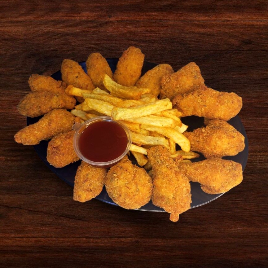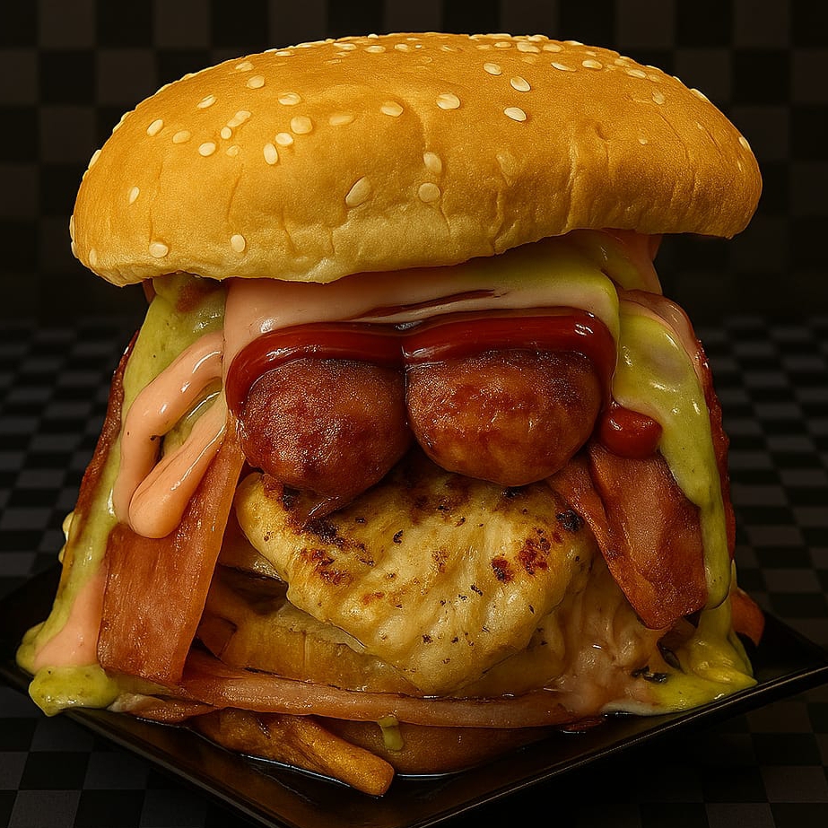 Carne artesanal 150 g, pollo, chorizo, ensalada, huevo frito, ripio, salsas, queso mozzarella y tocineta.
