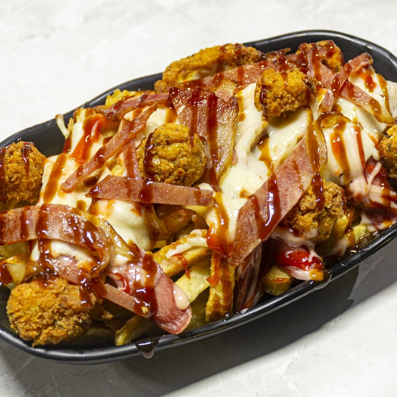 300 gramos de Papas con salsa maracuya de la casa, pollo crispy en BBQ, tocineta, salchicha y queso mozzarella