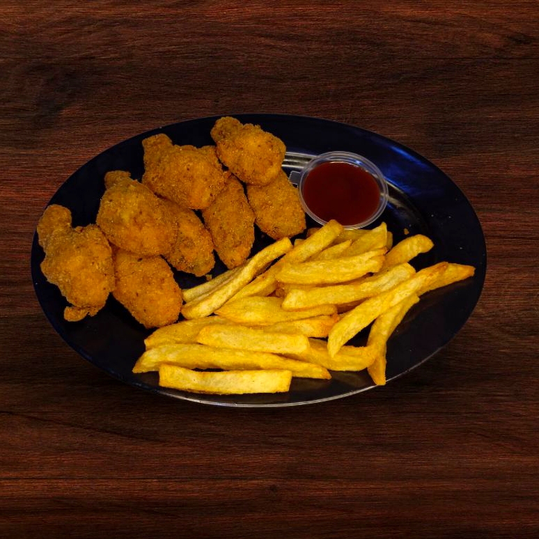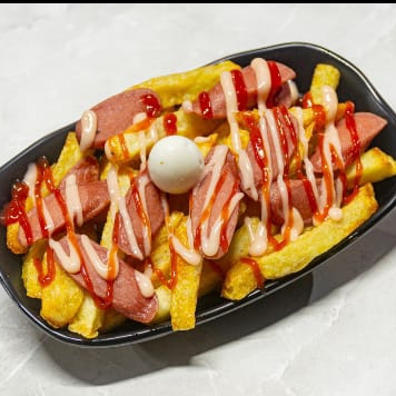 150 gramos de papas a la francesa acompañado de queso mozzarella, salchicha, tocineta , huevos de codorniz
