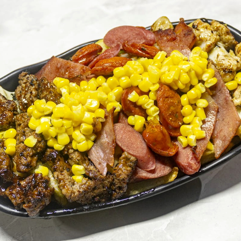 500 gramos de Papas con salsas, salchicha, carne, pollo, chicharrón, pulled pork, chorizo, maíz, queso mozzarella, queso costeño, tocineta y ripio