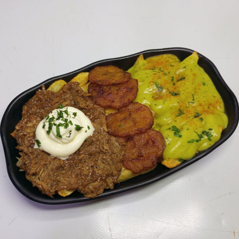 300 gramos de papas con un delicioso pulled pork en salsa bbq ,acompañado de salsa sour cream , platano y rico guacamole