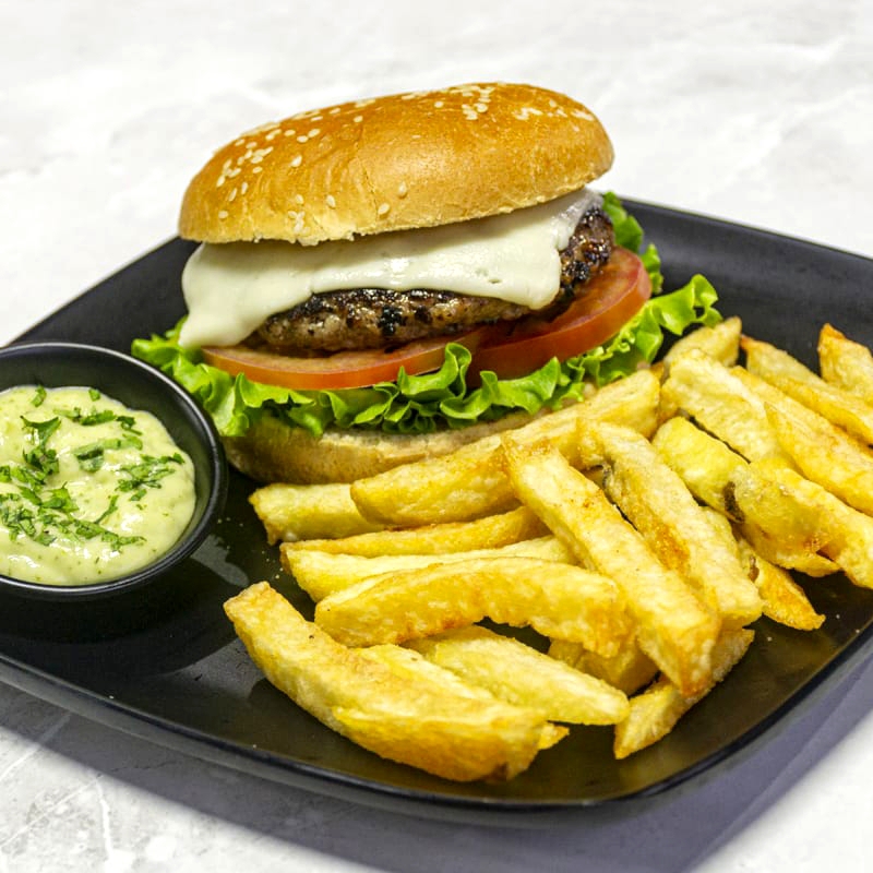 carne artesanal de 150 gramos acompañada de ensalada , queso mozzarella,ripio y salsas