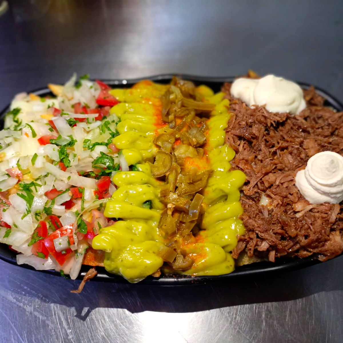 300 gramos de Papas con salsa de la casa, pulled pork, pico de gallo, queso mozzarella, guacamole, sour cream y jalapeños