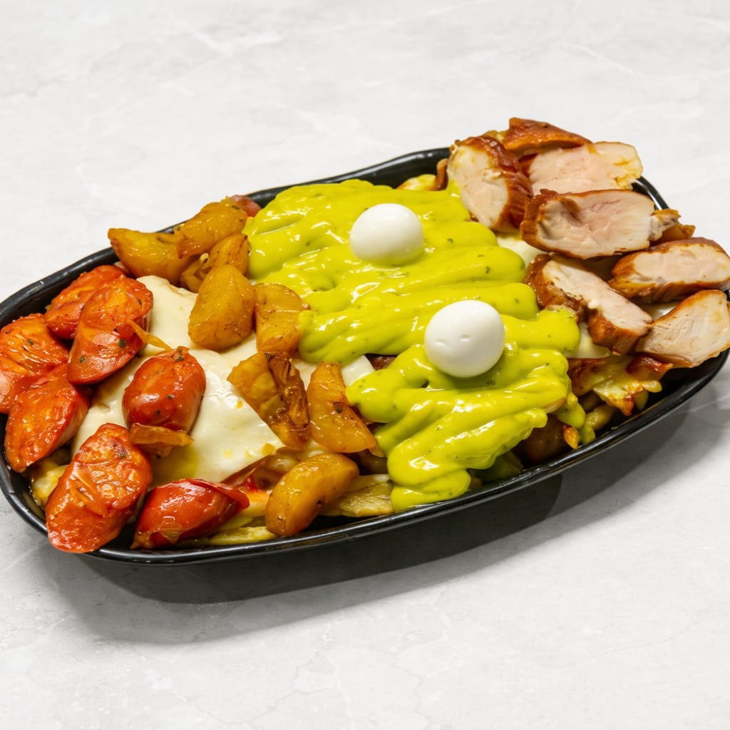 300gramos de papas con salsa de la casa, chicharrón, maicitos, queso mozzarella, chorizo, guacamole y huevos de codorniz