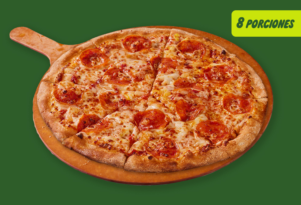 Pizza Masa Delgada con Pepperoni de 8 porciones. Incluye tu salsa de ajo por $2.700 pesos adicionales.