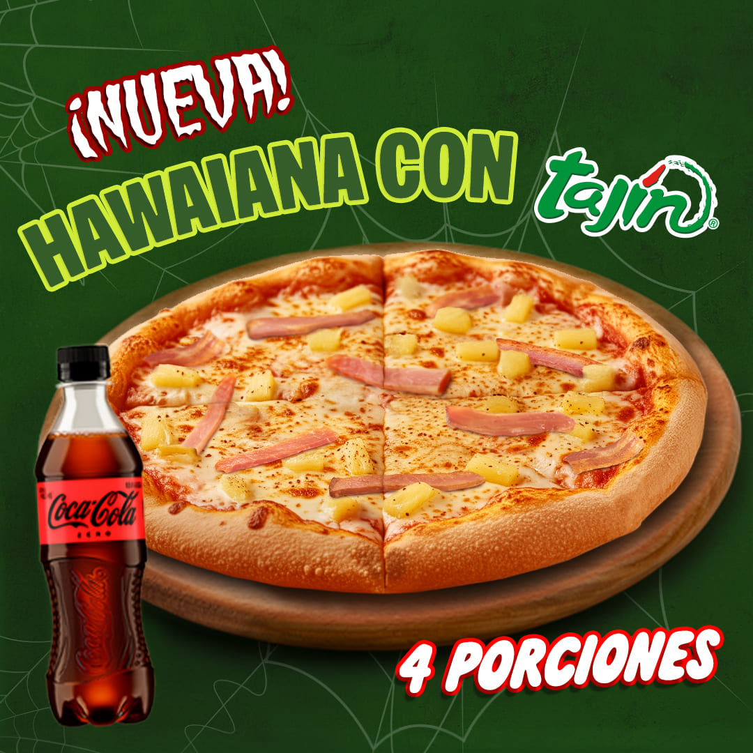 Pizza Hawaiana personal (4 porciones) extra piña, jamón canadiense y queso con Tajín. Acompañada con coca cola 400ml .