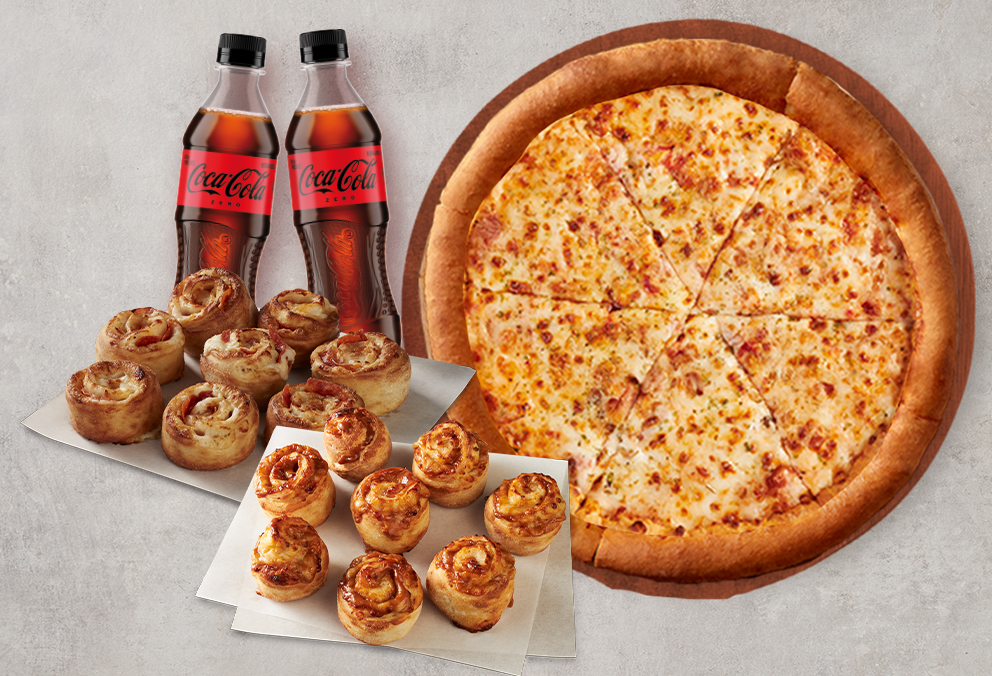 Pizza de queso (6 Porciones), acompañado de Pepperoni Rolls, arequipe rolls y 2 Coca Cola (400ML).
