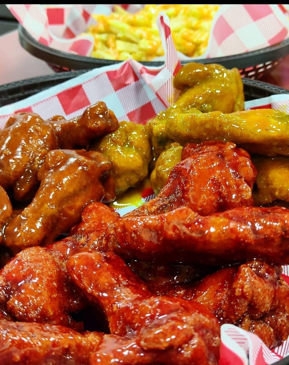 50 Alitas fritas a la brostear bañadas en salsa a elección con aprox 500gr de Papas a la Francesa con salsas a tu gusto