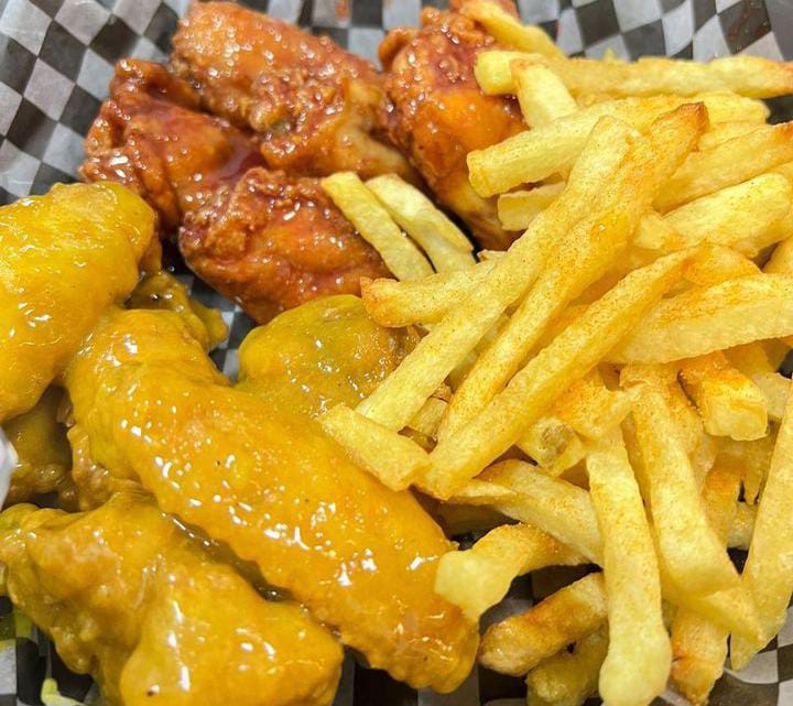 6 Alitas broaster fritas bañadas en salsa a elección acompañadas + Aprox.120gr de Papas a la Francesa