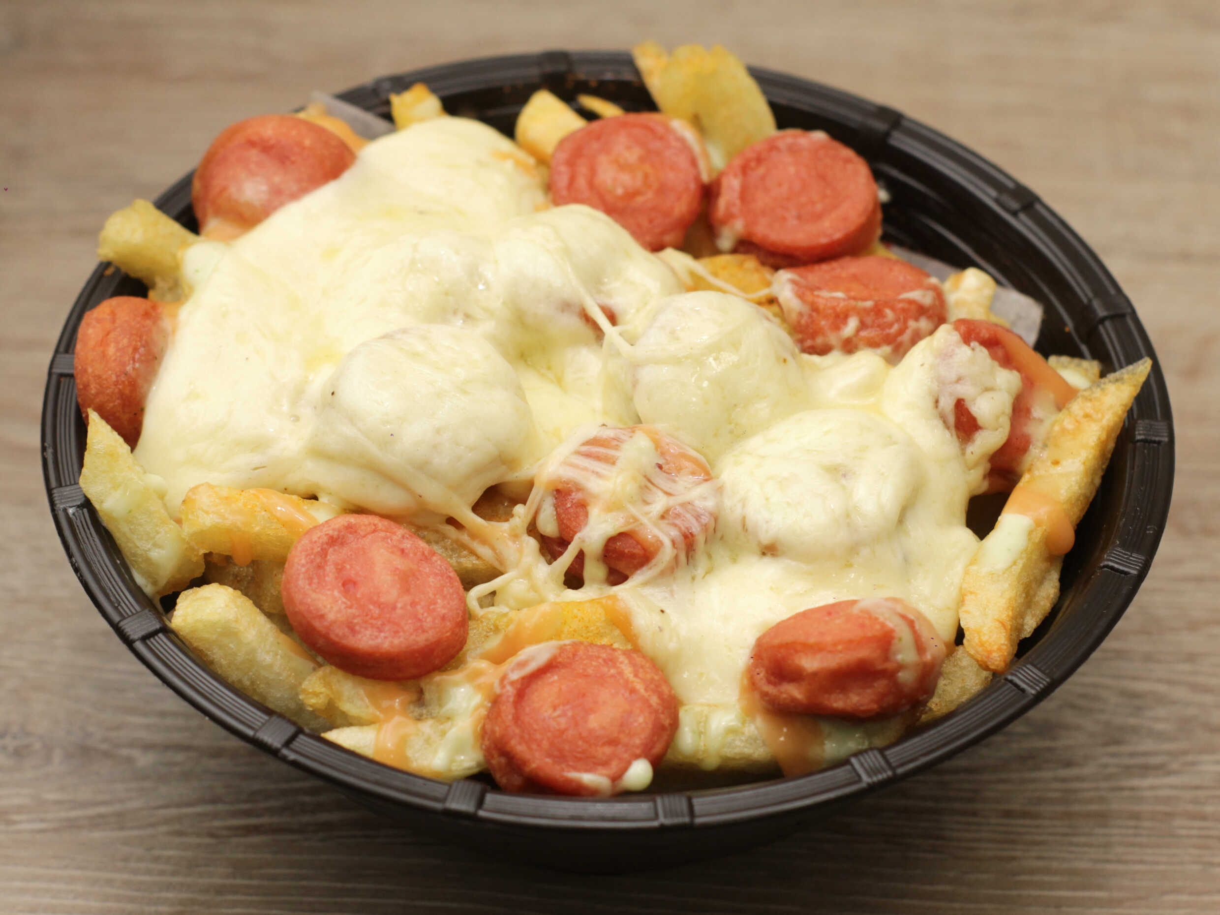 2 papas, salchicha, tocineta, queso, para dos personas.