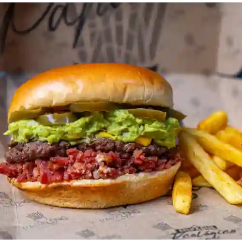 Pan parmesano, carne de hamburguesa premium 150g, guacamole casero, jalapeño, tocineta, queso cheddar, salsas de la casa, ajo, chipotle, nacho, queso, acompañado de 150g de papas.