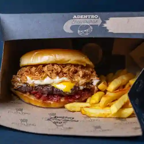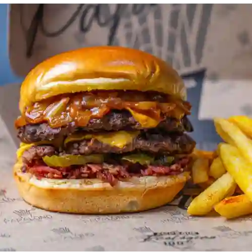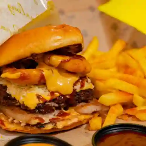 Pan parmesano, carne de hamburguesa premium 150g, tocino ahumado, aritos de cebolla, salsas de la casa, mayo ahumada, BBQ, nacho, queso, acompañado de 150g de papas.