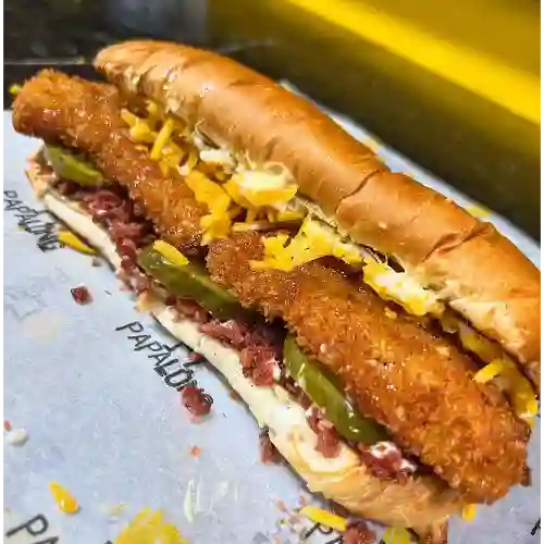 Pan parmesano, tiras de pollo apanado, ensalada, tocineta, queso cheddar, pepinillos, salsas de la casa, mayo, nacho, queso, acompañado de 150g de papas.