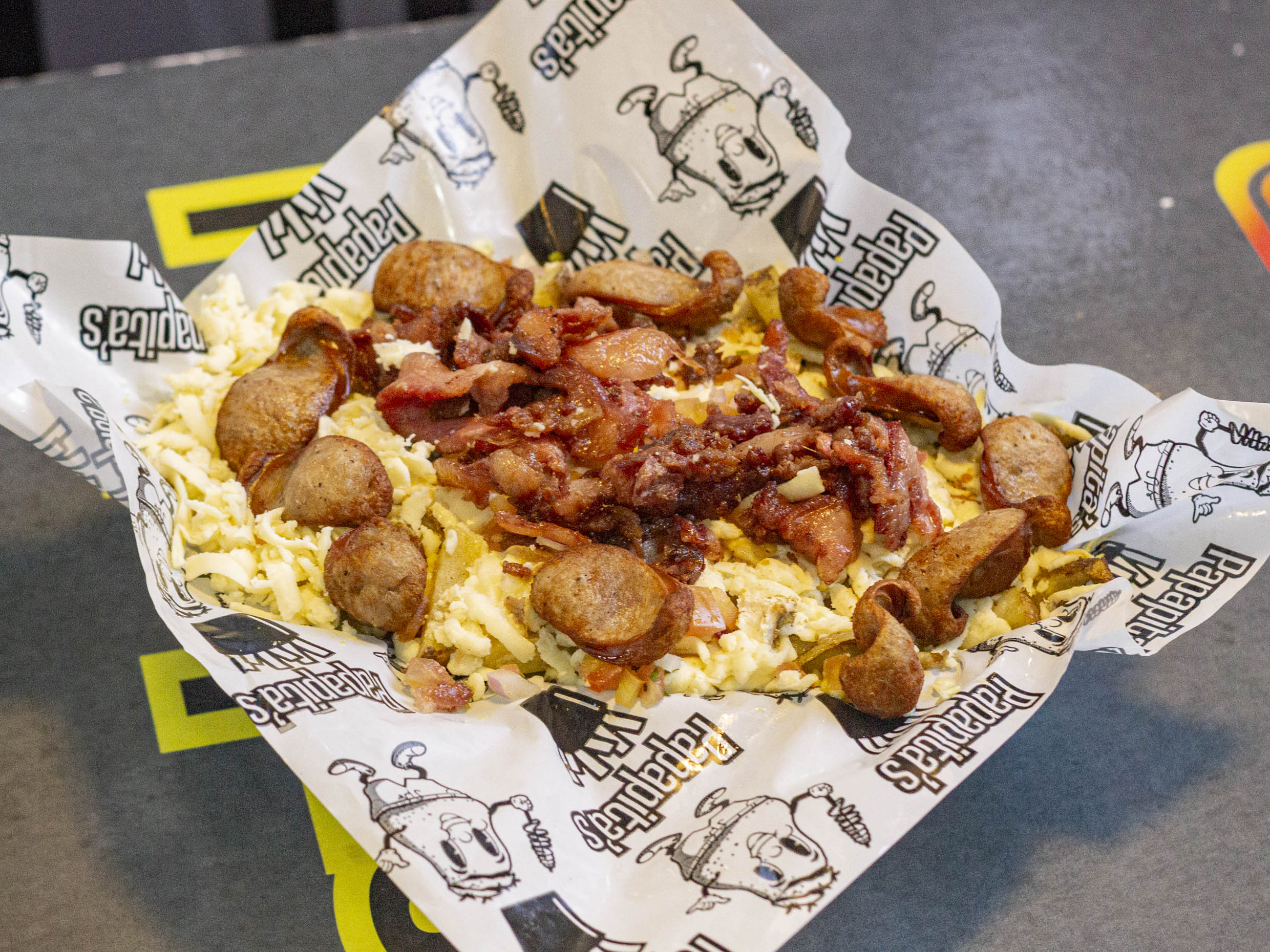 Papitas fritas, pollo desmechado, salchicha ranchera, juliana de chorizo, tocineta, maíz tierno, queso a elección.