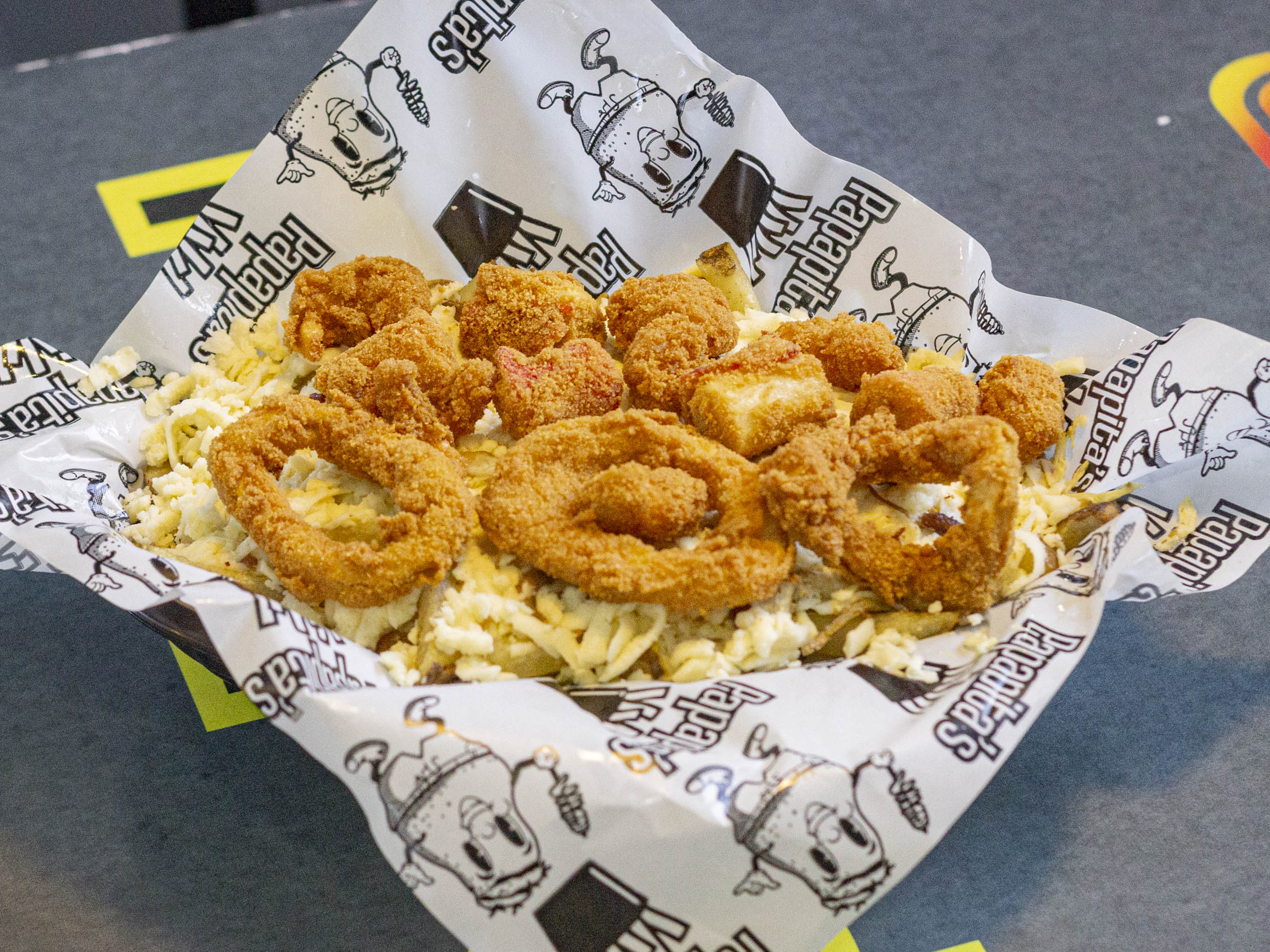 Papitas fritas, camarones apanados, palmitos apanados, aros de calamar apanados, queso a elección.
