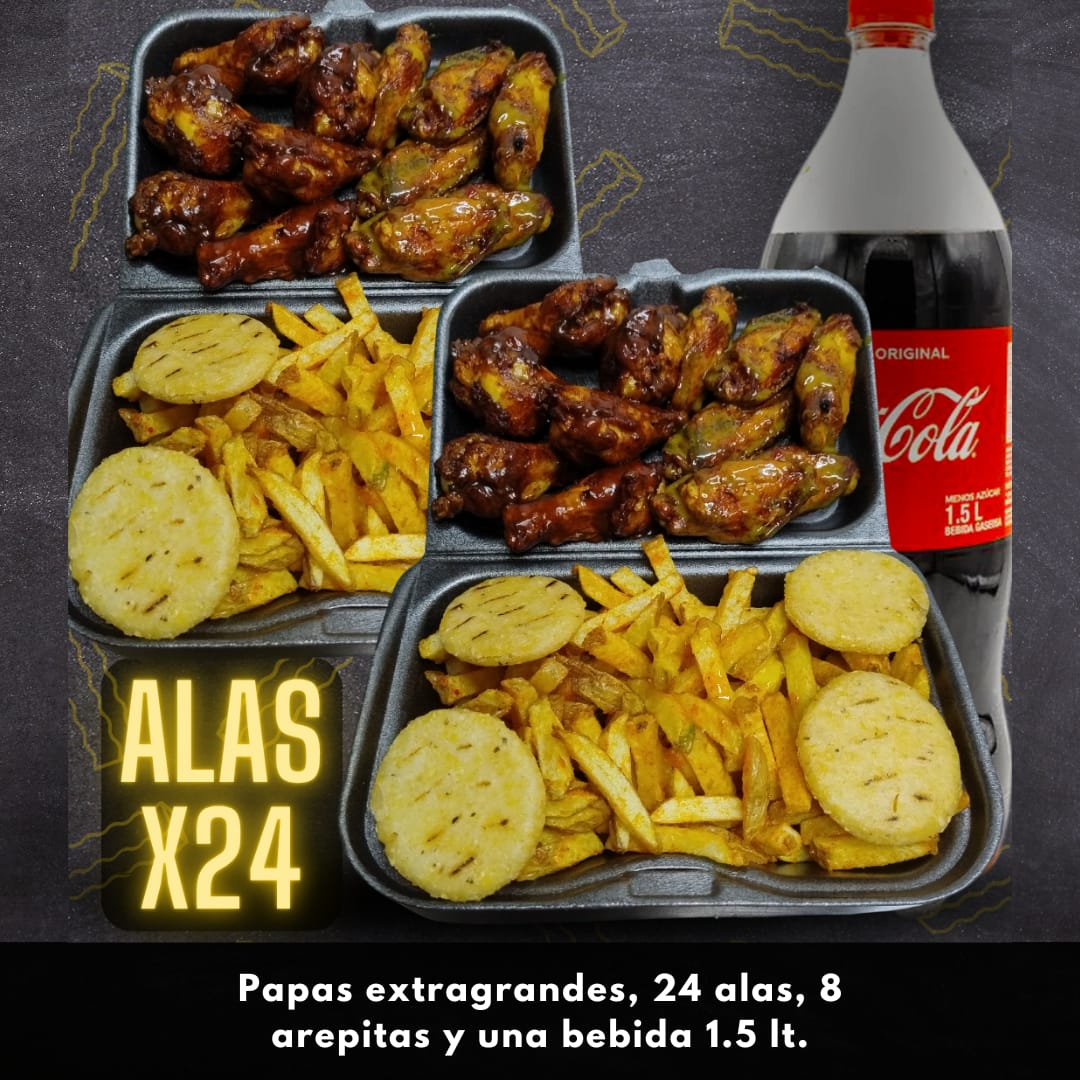 Papas fritas extragrandes, 24 alas, 8 arepas y gaseosa 1.5 L.