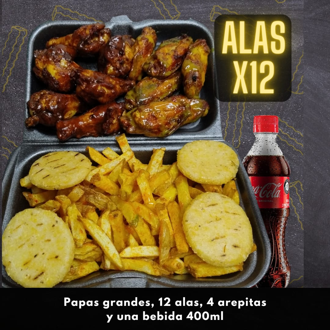 Papas fritas grandes, 12 alas, 4 arepas y bebida de 400 ml.