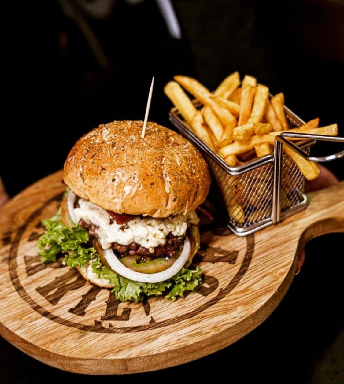 Pan artesanal, carne de res, chicharrón, queso, tocineta, lechuga, tomate, cebolla y salsas de la casa. Acompañada de papas a la francesa.