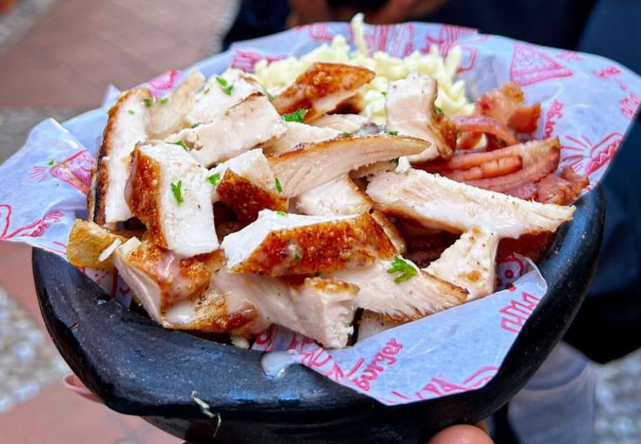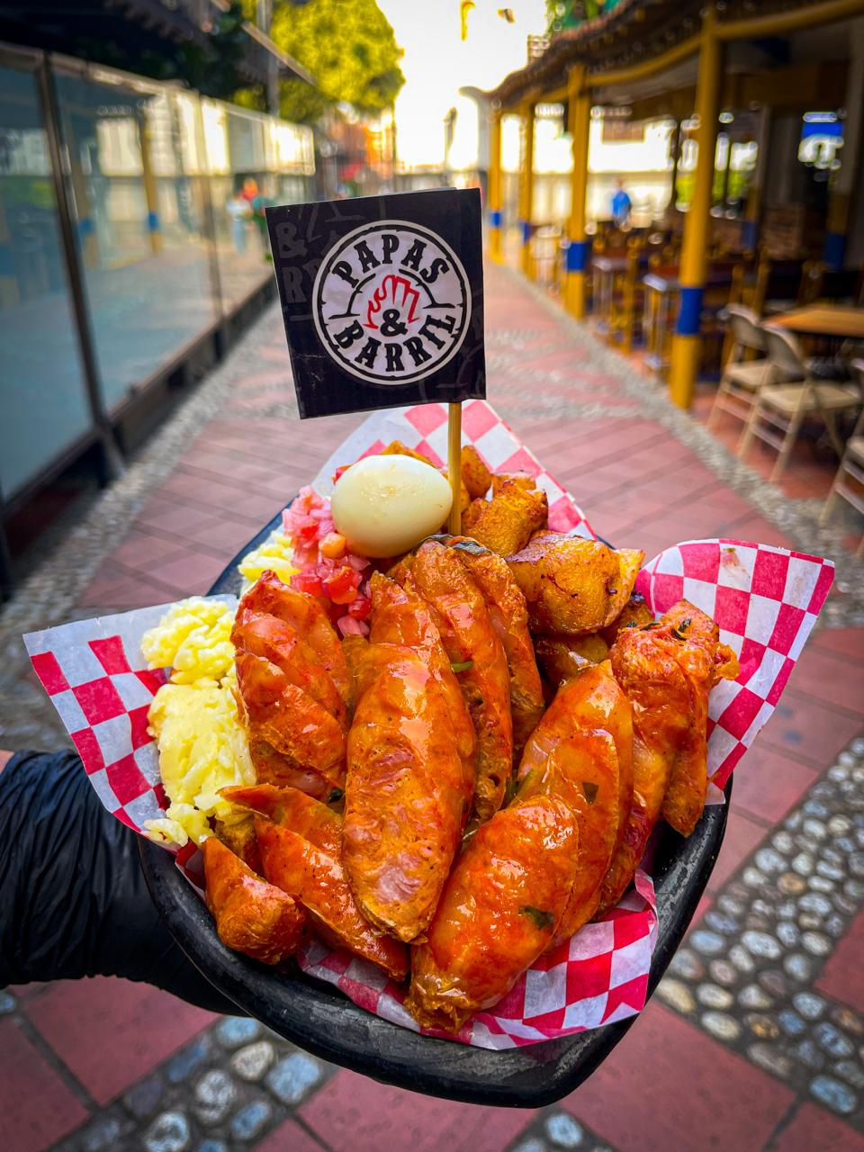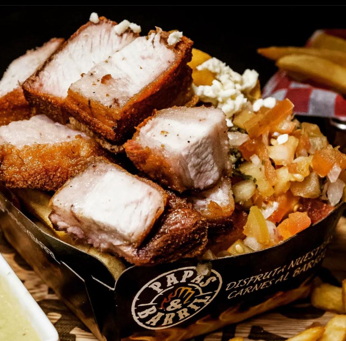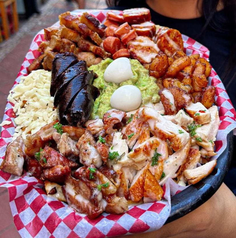 Papas artesanales, queso, 150 gr chicharrón al barril, morcilla, chorizo, 180 gr bondiola al barril, 180 gr pollo al barril, huevos de codorniz, guacamole, platano maduro, más salsas de la casa.