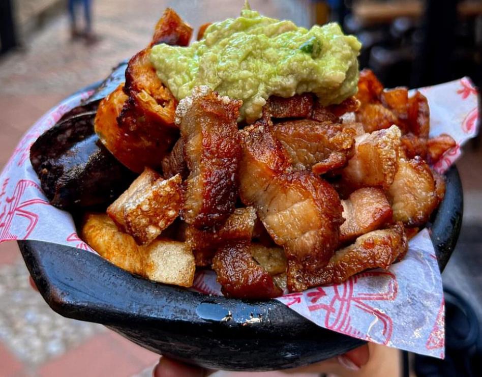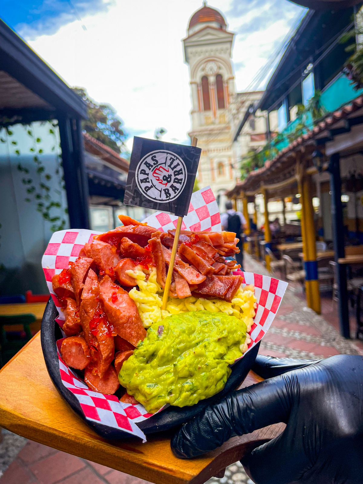Papas artesanales, queso, chicharrón, morcilla, chorizo, guacamole, plátano maduro más salsas de la casa.