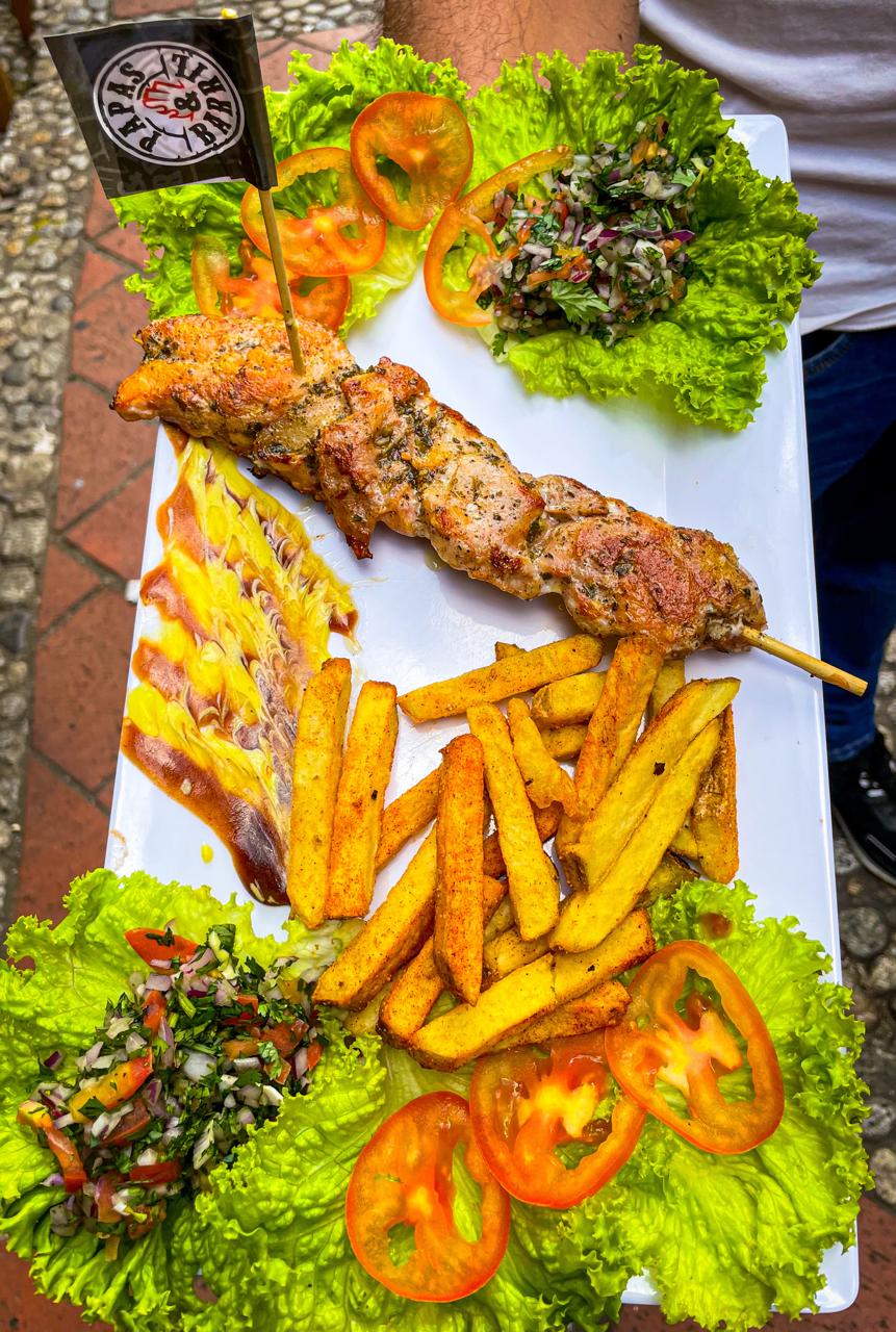 Chuzo de cerdo, ensalada de la casa, papas a la francesa.