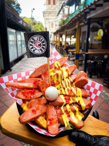 Papas artesanales, queso, salchicha, tocineta, guacamole más salsas de la casa.
