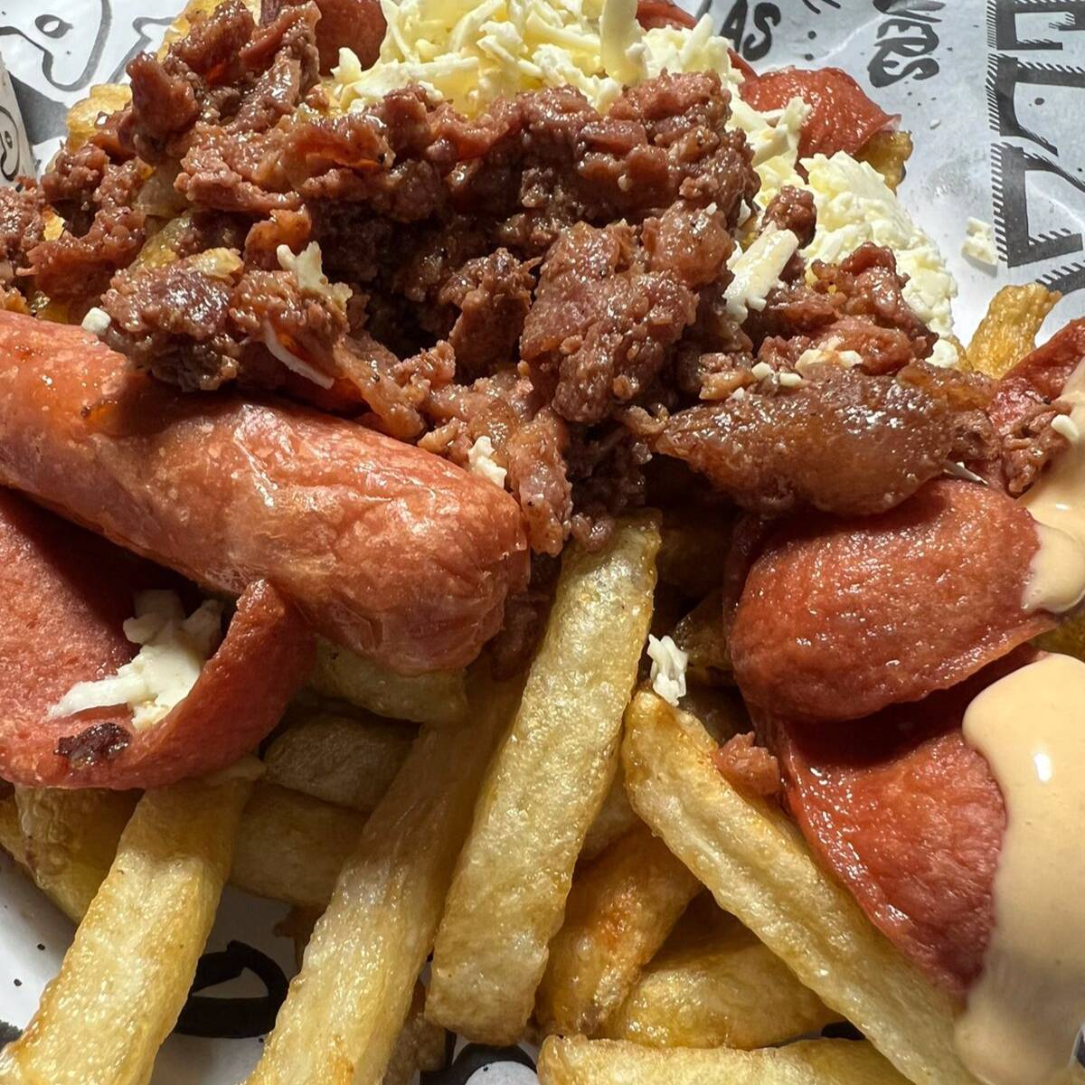 Papas a la francesa, + queso rallado + tocineta + 1 carne + 2 salchichas.