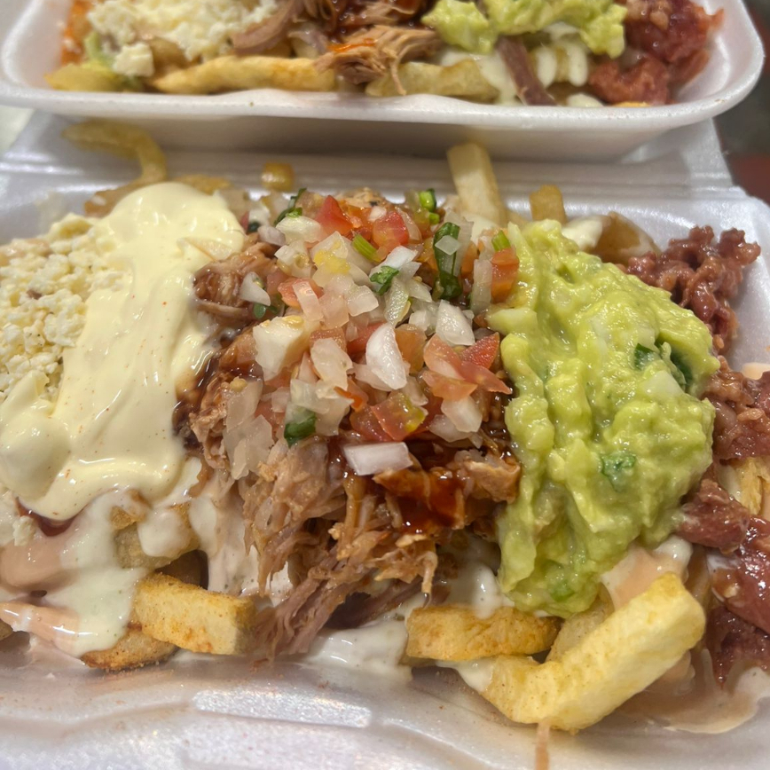 papa francesa, queso, tocineta,CARNE DESMECHADA, Guacamole, sour cream, pico de gallo