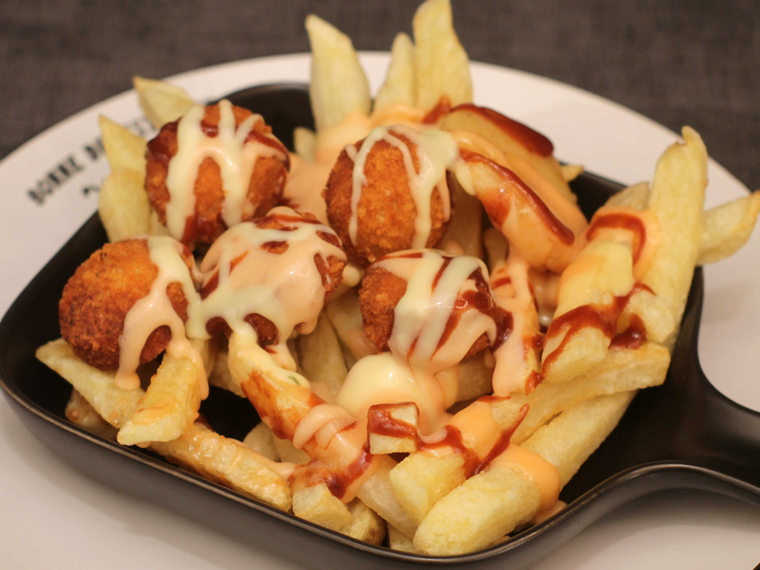 200 g de papas a la francesa con salchicha, chorizo coctelero, huevo de codorniz, una arepa y salsa de la casa.