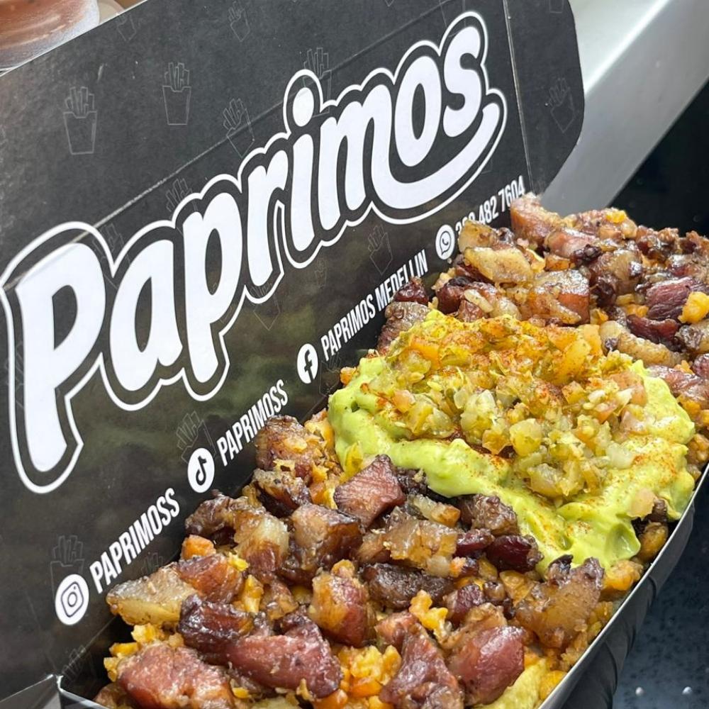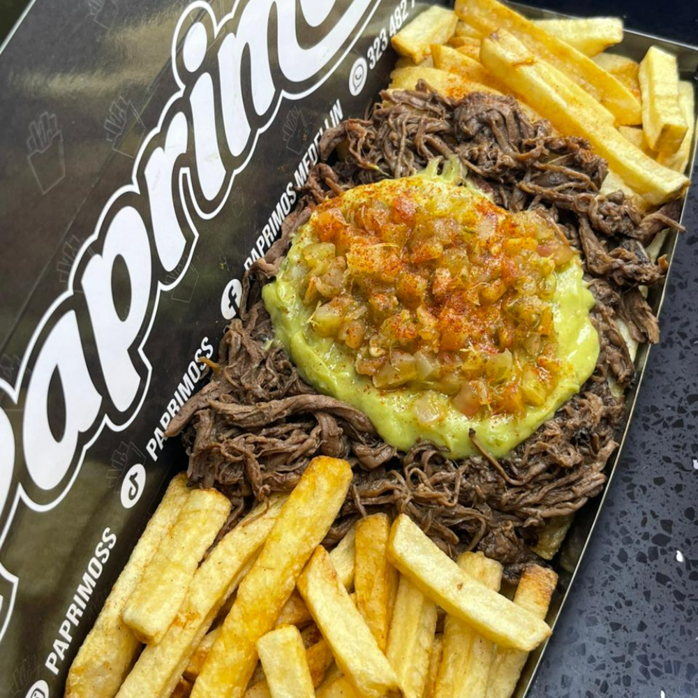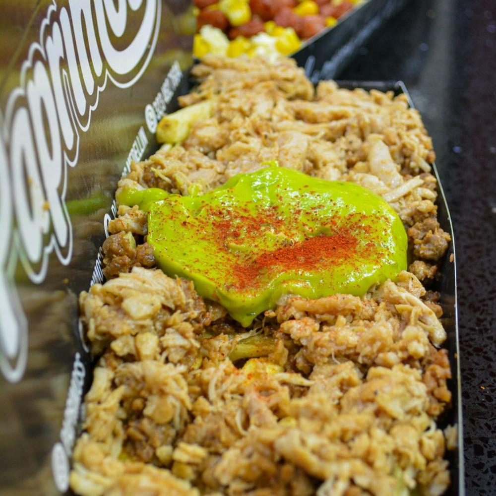 Crujientes papas, Cerdo a la BBQ, Carne desmechada levemente picante, Maduritos, Pico de gallo, Salsas al gusto