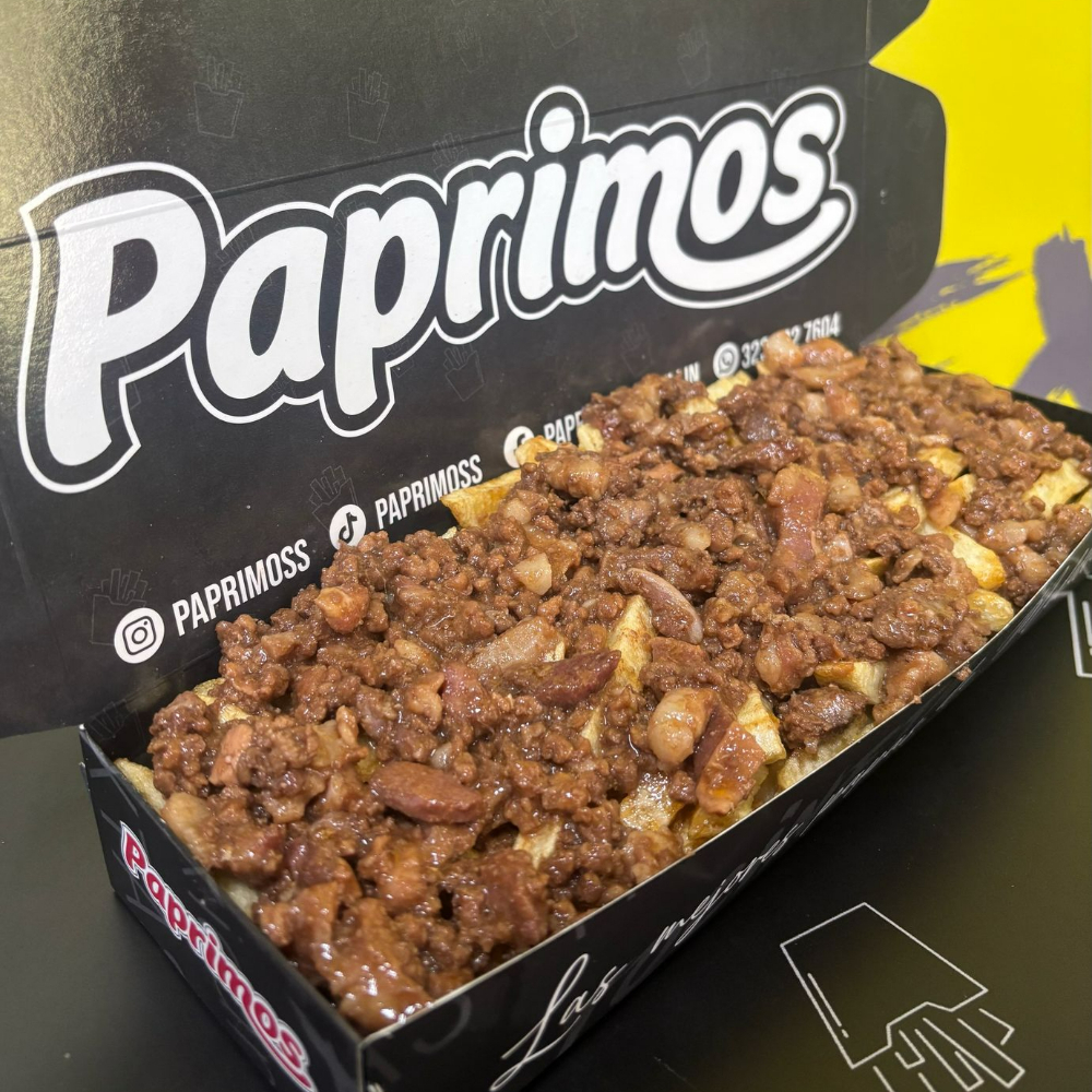 CRUJIENTES PAPAS, CERDO A LA BBQ, CARNE DESMECHADA LEVEMENTE PICANTE, MADURITOS, PICO DE GALLO, SALSAS AL GUSTO