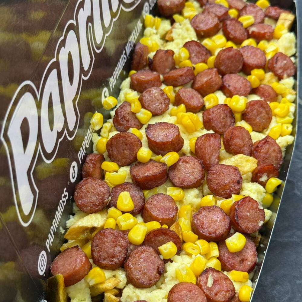 CRUJIENTES PAPAS, SALCHICHA PREMIUM, QUESO RALLADO, MAICITOS, SALSAS AL GUSTO
