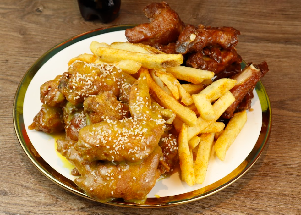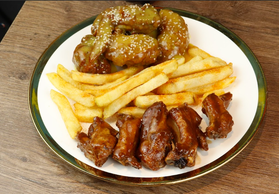 5 Deliciosas alitas y 5 jugosas costillitas bañadas en nuestras ricas salsas de tu preferencias BBQ o miel mostaza artesanal mas papas a la francesa y gaseosa de 250 ml.