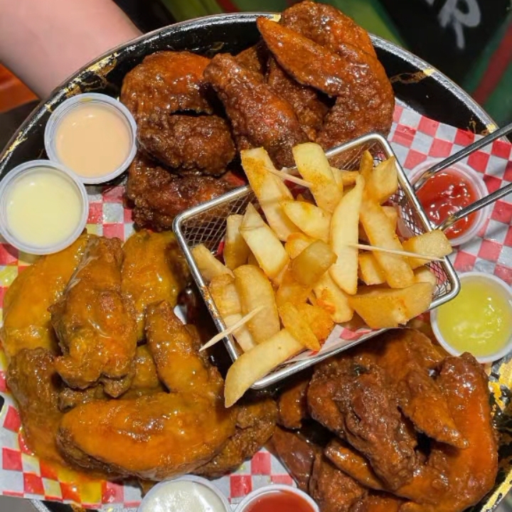 30 Deliciosas alitas bañadas en nuestras ricas salsas de tu preferencias BBQ o miel mostaza artesanal mas crujientes papas a la francesa.