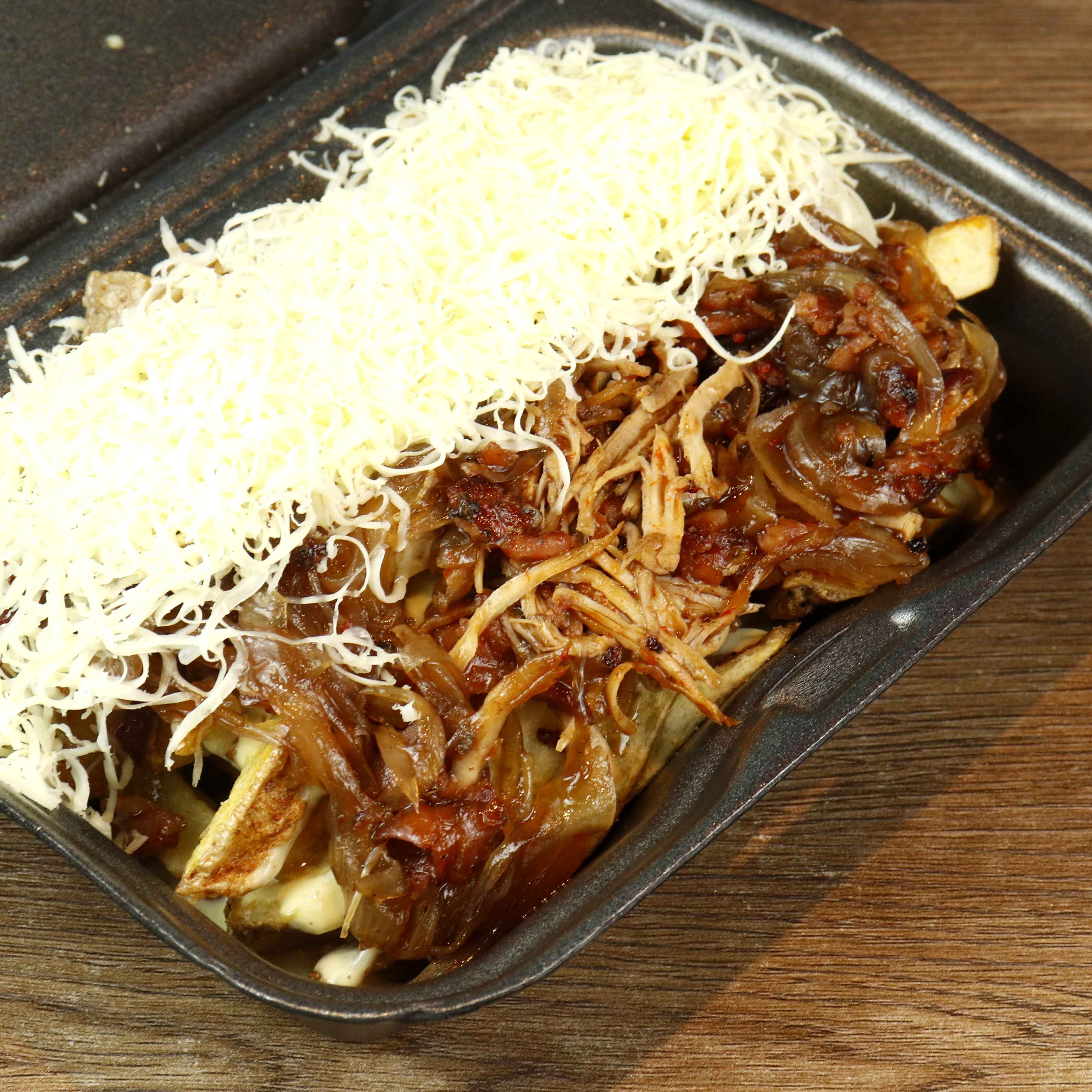 Papa a la francesa, costillas de cerdo despechadas, tocineta crispí, cebolla caramelizada parcera bañadas en bbq, salsa de la casa y queso mozzarella.