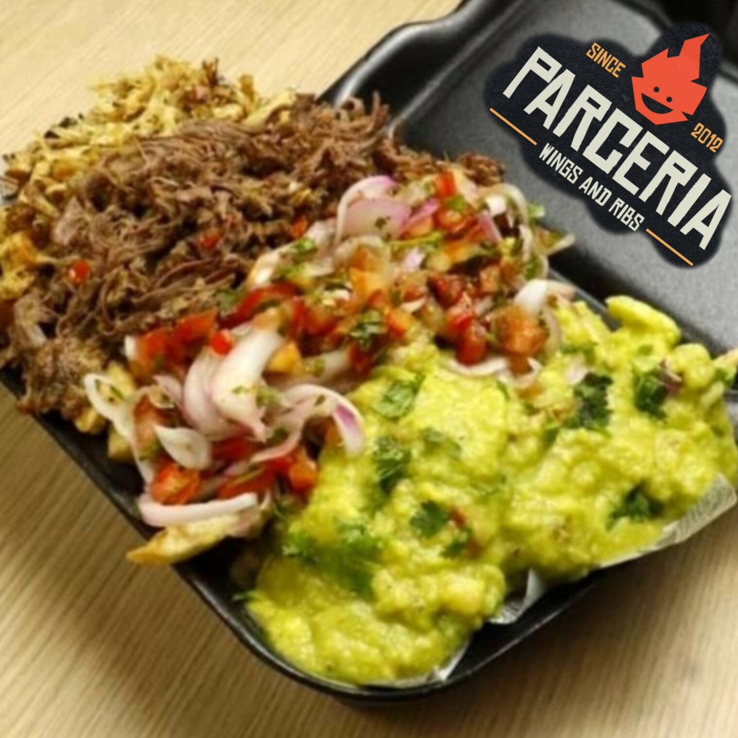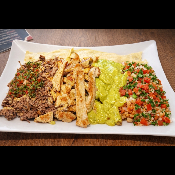 Papa francesa, carne despechada en chimichurri, pollo a la parrilla, guacamole, pico de gallo, salsa de la casa, queso mozzarella.