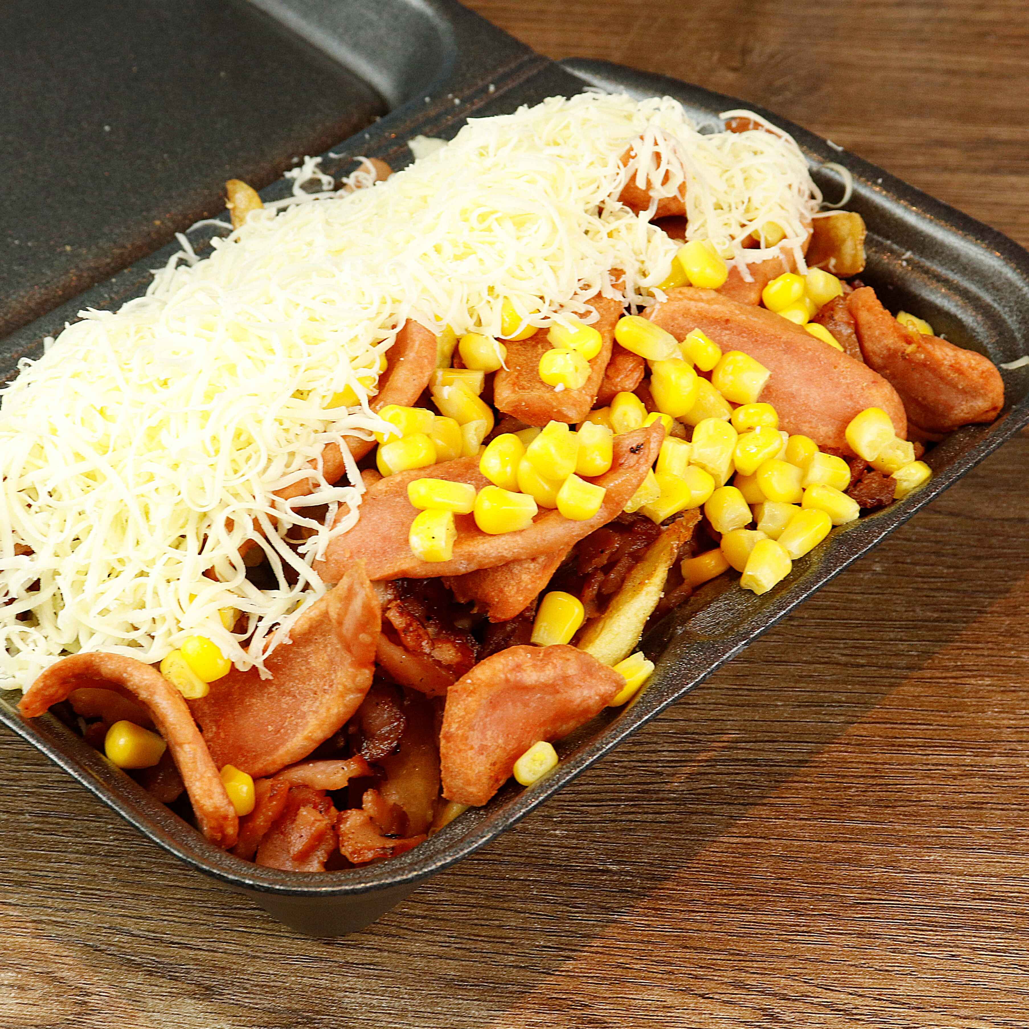 Papa a la francesa, tocineta crispí, salchicha Zenú, maicitos tiernos, salsa de la casa, salsa rosada, queso mozzarella.