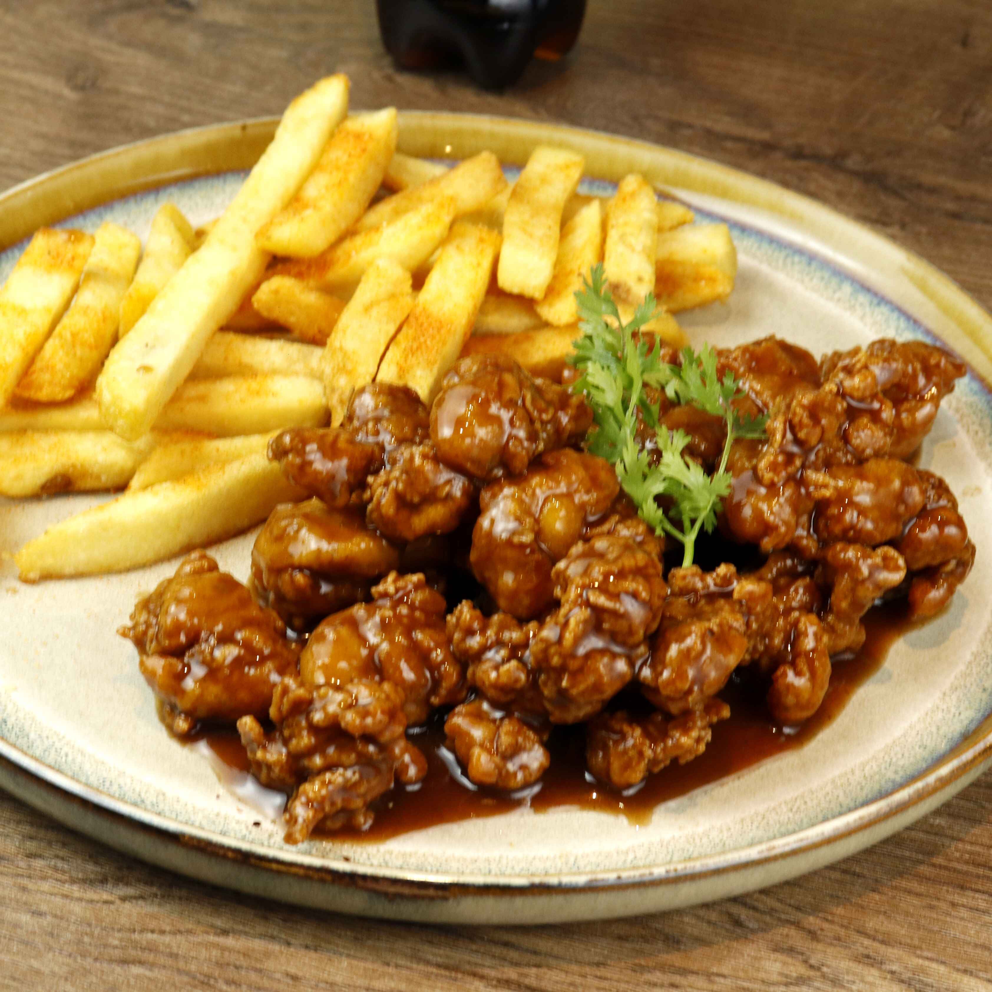 175 g De finos trozos de pechuga apanados, bañados en salsa BBQ o miel mostaza mas papa a la francesa y gaseosa 250 ml.