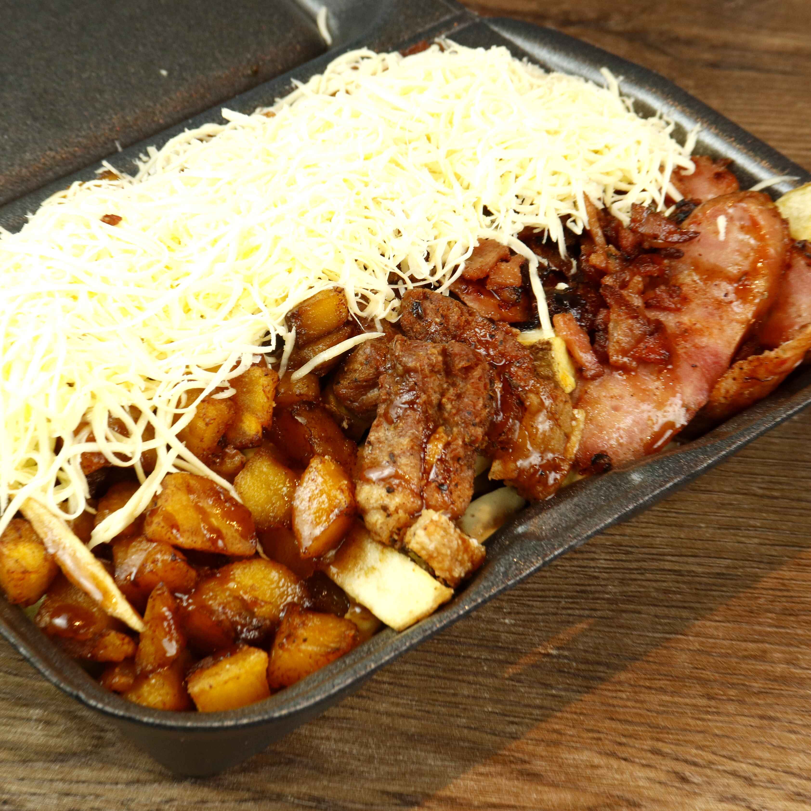 Papa a la francesa, jugoso chicharrón ahumado, maduritos, crocante tocineta, chorizo artesanal, sour cream, deliciosa salsa BBQ, salsa de ajo, queso mozzarella.