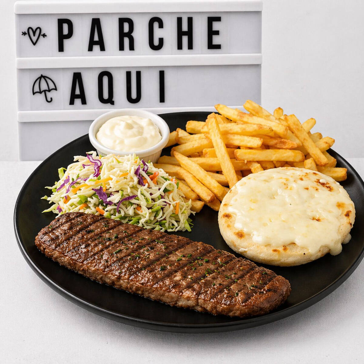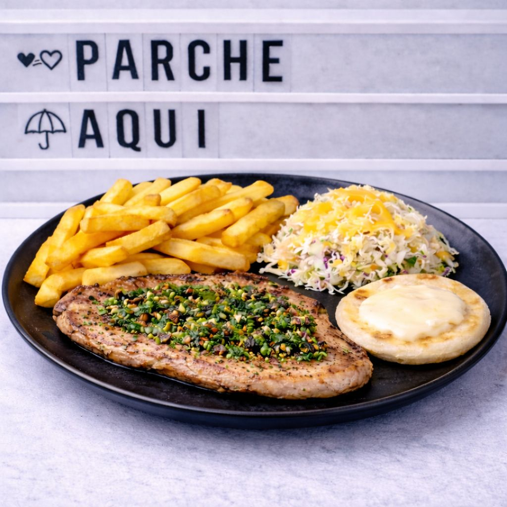 Carne de Res 150g 🥩🔥 Jugoso filete de res a la plancha de 180g, acompañado de papas fritas doraditas, ensalada fresca, arepa con queso y chimichurri artesanal.