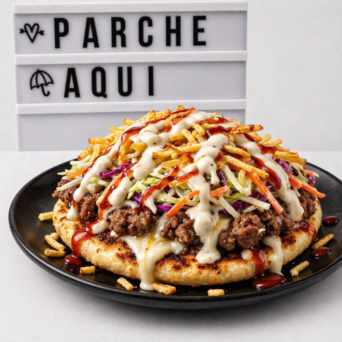 Arepaburger 🤤 Una fusión única: arepa rellena con jugosa carne de hamburguesa 150g, queso mozzarella derretido, crocante ripio de papa y ensalada de repollo casera. ¡Sabor criollo con todo el poder de una burger!