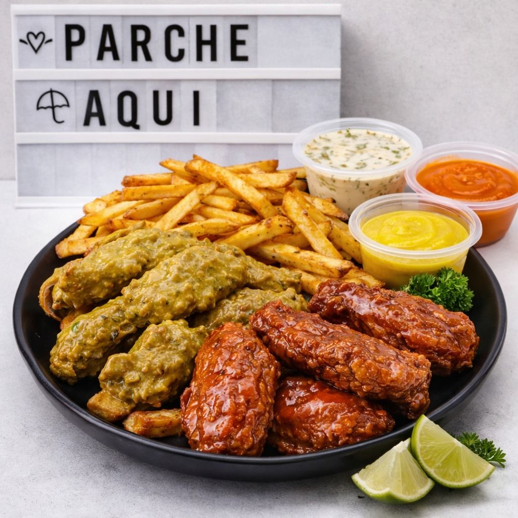 8 Trozos de Alitas + Papas Fritas 🍗🍟 Alitas apanadas (8 unidades) bañadas en salsa artesanal de la casa, acompañadas de papas fritas doraditas y 2 salsas para disfrutar al máximo."