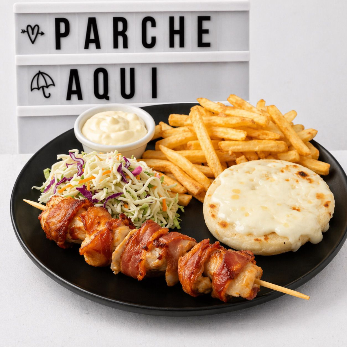 Delicioso chuzo de pollo con tocineta, servido con arepa con queso, ensalada fresca de la casa, papas francesas doradas y chimichurri artesanal.