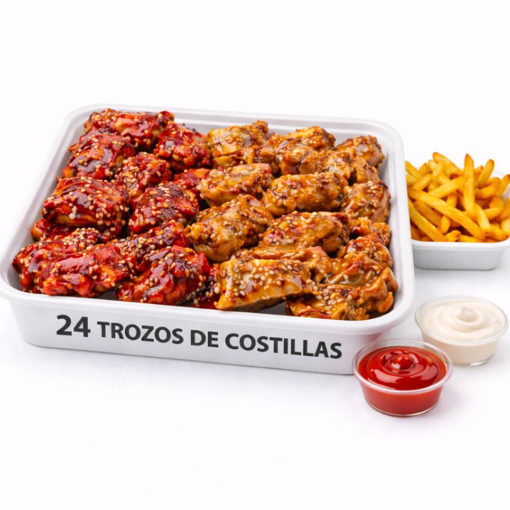 Combo con 24 trozos de costillas jugosas bañadas en la salsa de tu preferencia, acompañado de papas fritas familiares. ¡Un festín abundante para compartir y disfrutar a lo grande!