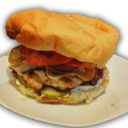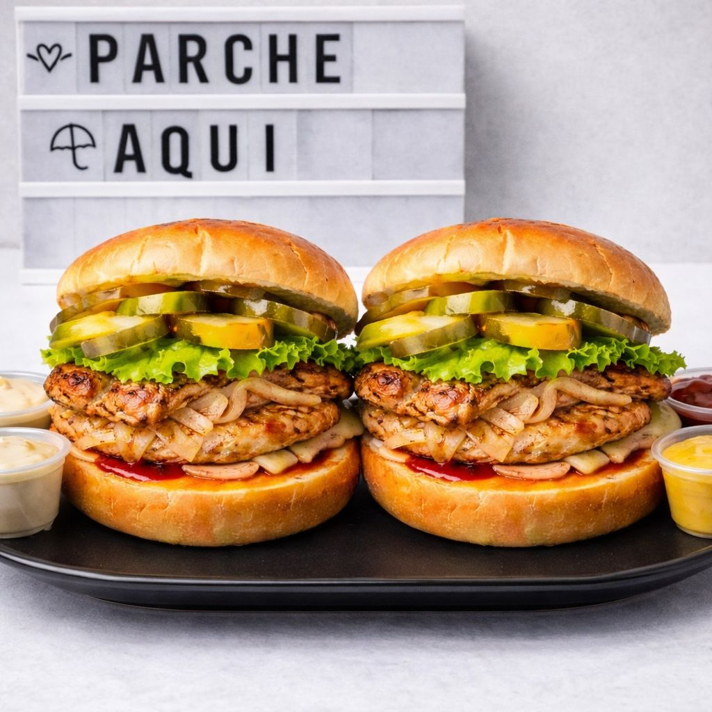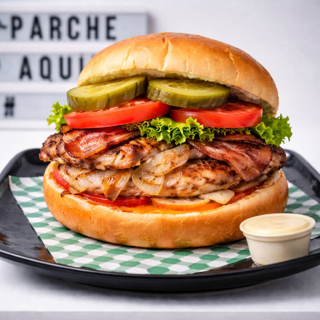 Hamburguesa de Pollo con filete a la plancha o apanado, tocineta ahumada crujiente, queso mozzarella derretido, cebollas caramelizadas, pepinillos agridulces, lechuga fresca y tomates jugosos. Incluye papas fritas crocantes. ¡Una opción deliciosa y versátil para todos los gustos!