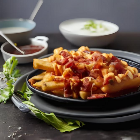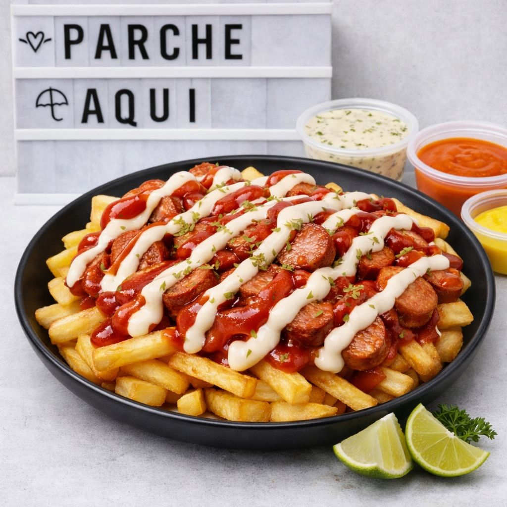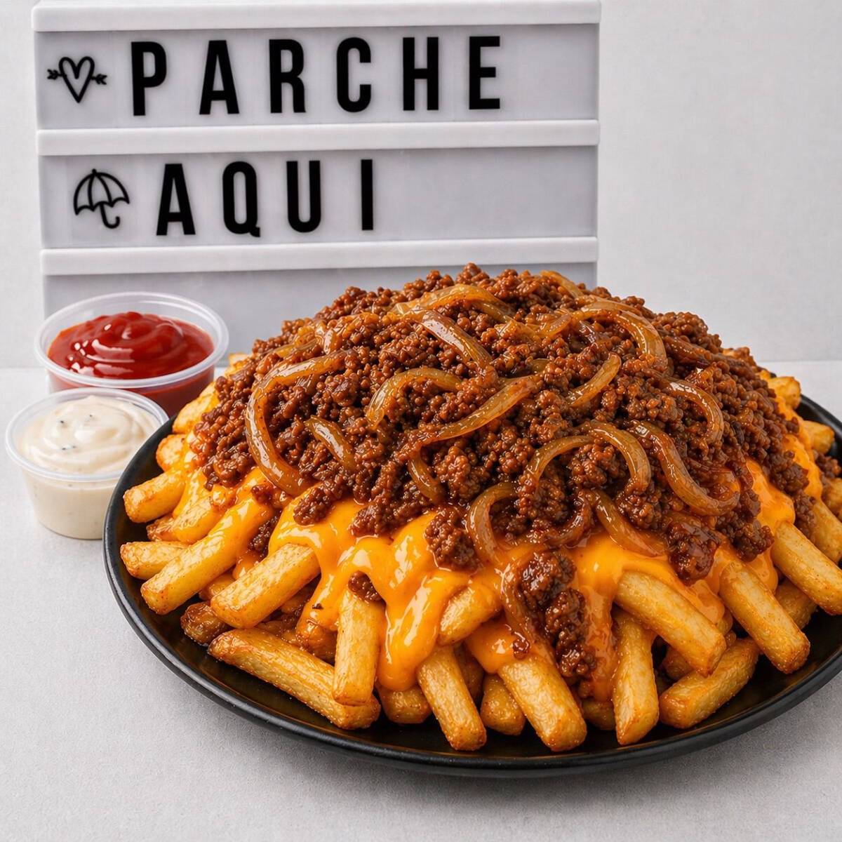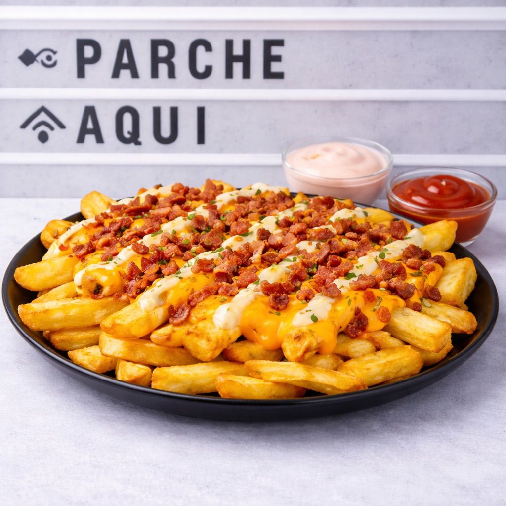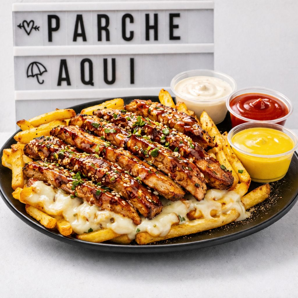 Porción generosa de papas fritas cubiertas con queso mozzarella derretido, carne de res y cerdo picados a la plancha, bañados en la salsa de tu preferencia. ¡Una combinación perfecta para los amantes de lo mixto!