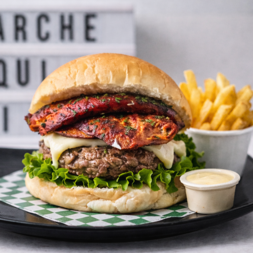 Déjate llevar por esta hamburguesa galáctica: filete de pechuga a la plancha y carne smash 120g, con queso mozzarella derretido, ensalada de repollo dulce, cebollas caramelizadas, tocineta ahumada, pepinillos agridulces, lechuga fresca y tomates jugosos. Acompañada de papas fritas crujientes. ¡Un sabor que rompe fronteras!
